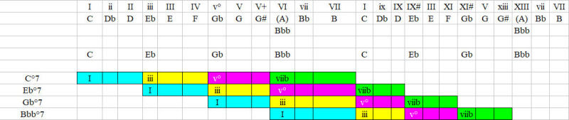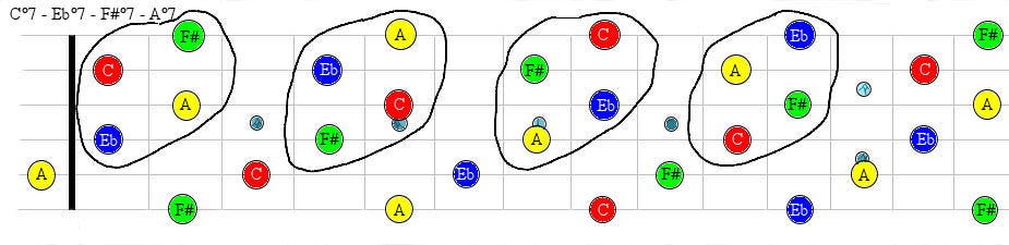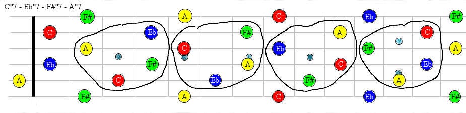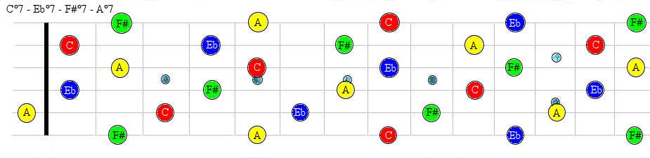 As you can see in this graph, the C°7 notes are: C - Eb - Gb and Bbb (A). Each note is a “root” note, as the structure is repeated in minor 3rds.